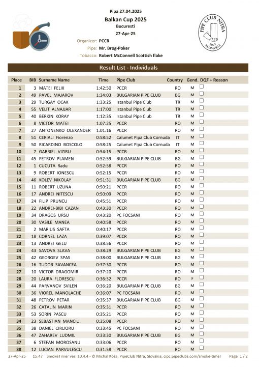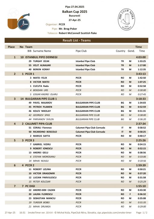 Balkan Cup 2025 Bükreş yavaş pipo içme yarışması büyük bir neşe içinde tamamlanmıştır. Takımımız 4:03:00 ile birinci olmuştur. Katılan üyelerimize başarılarıdan dolayı çok teşekkür ederim.